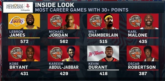 火箭主场迎战步行者,转播方晒出历史30+场次排名,杜兰特418场排名第七。